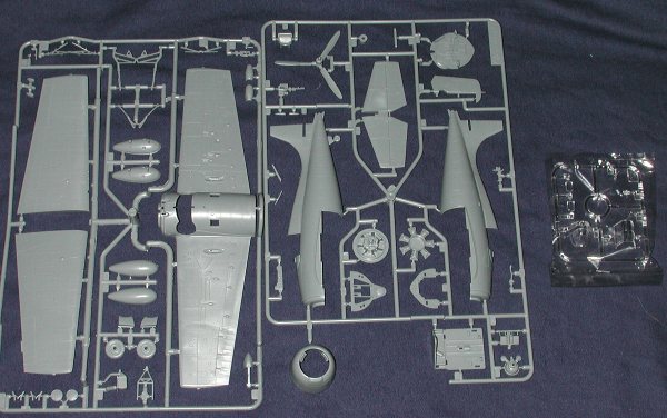 There are two large sprues of grey plastic along with a clear sprue and some of those plastic grommets to hold in the prop. The only real options on the kit are open or closed canopy and drop tanks. Frankly, most will do away with the drop tanks as they just look odd on the plane. The detailing is very good and there are plenty of rivets on the kit just like the real aircraft. Only these are pretty close to scale and not the 'golf balls' of older kits.