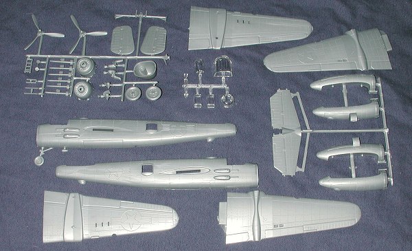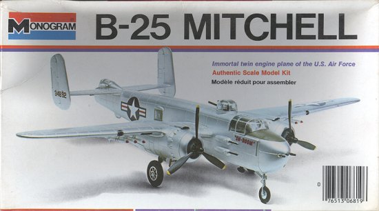 My good buddy Roger Jackson tells me that this is the first fully injected plastic aircraft kit that Monogram did and judging by the 1955 initial release date and other aspects of the kit, I believe him! He also tells me that it scales out to 1/69.5 which is close enough to 1/72 to make most people happy. Monogram chose the B-25H version to kit and in that respect, they hit all the salient features of the type when they did the model. As you might expect, it is chock full of rivets (which makes it very 'accurate' by the days standards).