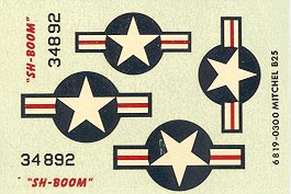 Frankly, I suspect the markings of being totally spurious. I seriously doubt if any B-25H was armed with rocket rails and I'm equally sure that they were being cut up well before 1947 when the red bar was added to the national insignia. Fortunately, there are 1/72 sheets for the H model and one of them should fit this kit without too much problem. Or you could go ahead and use what's in the kit just to have something to remind you of your youth. Why not.