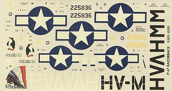 Another difference from the bubbletop kit is that this one has the 'standard' Curtiss-Electric prop. Real P-47 enthusiasts will be careful to note whether the plane they are modeling has the correct prop (there was also an asymmetrical version) and whether the shape of the lower engine cowl flaps is the correct size. I'll leave it up to the experts to make a choice on the accuracy of the kit vs the decal options that are provided. One thing for sure, there are oodles of aftermarket decals for the razorback D so finding something shouldn't be too difficult. That aftermarket may be needed as on this kit, the decals are also 25 years old which puts to question their usability.