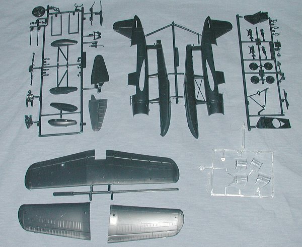 The date on this box is 1977, but I know that this kit was out even earlier, perhaps 1966-68. Molded in dark blue plastic, the kit is quite complete with a nicely done interior and good detail (albeit raised panel lines). Its age is apparent with the requirement to slot the wing through the fuselage when assembling it, but this should pose no real problems. The fabric effect of the wing and control surfaces is not too badly done. The aircraft comes with options for under wing bombs and includes beaching gear. The ability to build the wheeled version is provided, though it means cutting away the large central float. Personally, I'd cut this float off anyway to make it easier to clean up the lower fuselage seam. The float can then be reattached.