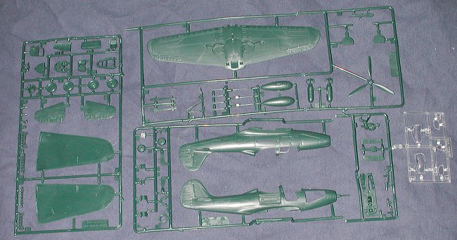 Molded in a dark green plastic, this 1989 boxing is still nice and crisply molded. Raised panel lines are the norm, though that does not detract in any way from the quality of the molding. There are the usual ejector pin marks in the 'wrong' places (inside of doors, gear wells and such) as well as a few sink marks on a few of the thicker parts like the interior aft bulkhead and pilot figure. You'll note that the long sprues have been cut to fit into the smaller box than originally designed. Clear bits are well done though thicker than what we've come to expect.