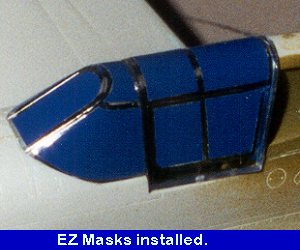 The EZ Masks were then taken off. They came of easily and there was only a tiny bit of leakage at one area. Probably the nicest thing about them is that there was NO residue to clean up. However, I did notice that somehow I managed to get glue on the inside of the windscreen between it and the glare shield. Just part of the many disasters that accompany most of my models! The aft windows were installed at this time using white glue. There is a landing light that goes under the wing. This part proved to be poorly molded in that it was about twice as thick as the slot it was designed for. Rather than go through the tedious method of sanding it down, the area was filled with white glue, which gave an acceptable representation of the light. The various formation lights were painted, the radio wire was attached using stretched sprue and the kit was done.