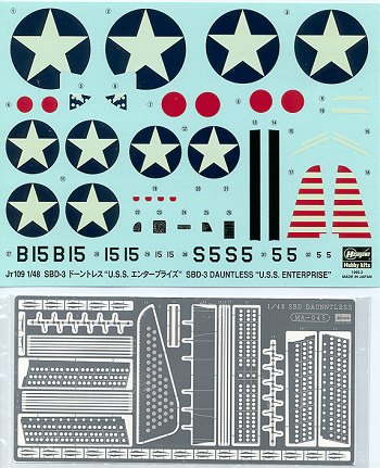 The instructions are quite good and provide a detailed construction evolution; especially the part for the metal dive brakes. Paints are the usual Gunze ones and the decals are typical Hasegawa kit ones being a bit thick and with ivory vice white decals. Markings are for two planes. One is the box top one from the USS Enterprise at Midway in June of 1942. The other is from the USS Hornet with the red dot in the insignia and the red/white tail bands. It says Midway in July of 1942, but I don't think so as most US planes had removed the red dots and tail stripes around this time. Regardless, it is a very colorful scheme. There are lots of aftermarket decals for the -3 SBD in case you don't want to use the kit one.