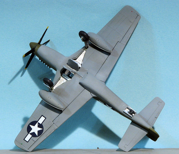 Using Model Master enamels, I painted the underside neutral grey and the upper surfaces an olive drab. Since there was no additional color to the airframe, this makes for a pretty quick paint job. I also prepainted the gear legs and inner gear doors aluminum and the prop black. Later the blades were masked and the spinner painted OD along with the rest of the upper surface of the airframe.