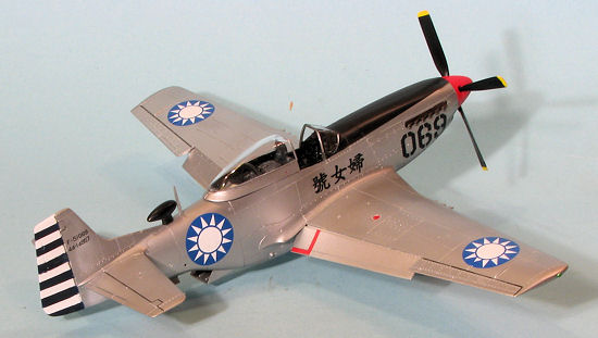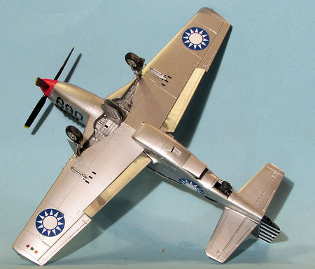With things pretty well done, I attached the radio mast and glued on the inner gear doors and actuators. The landing light was then cemented in place. Thanks to reader jmclaugh, I was able to get an ADF antenna for aft of the radio mast. The mount was thinned and a hole drilled for it. It was fit as far aft as I could, but even then it barely touches the radio mast. The actual base used on ROCAF Mustangs is different and angles more to the rear to give clearance. Still, it looks pretty good and is a part that all these planes used. I then gave the airframe a coat of semi-matte clear to dull down the metallic sheen. The ID lights and clearance lights were painted and the prop blades glued in place. I finally removed the masking, popped off the canopy, installed the seat and glued the canopy back in place.