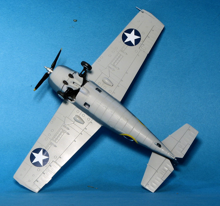 The vast majority of F4F-4s were painted in blue-grey uppers with light grey undersides. Those that survived and were overhauled were given the tricolor scheme, but by then, most Wildcats in the fleet were the four gun FM-1s. Painting is simple enough. The underside was painted light gull grey, along with the outer wheel hubs and the gear doors. I then masked some of the underside bits and painted the rest of the airframe with blue-grey. I used Model Master enamels for this.