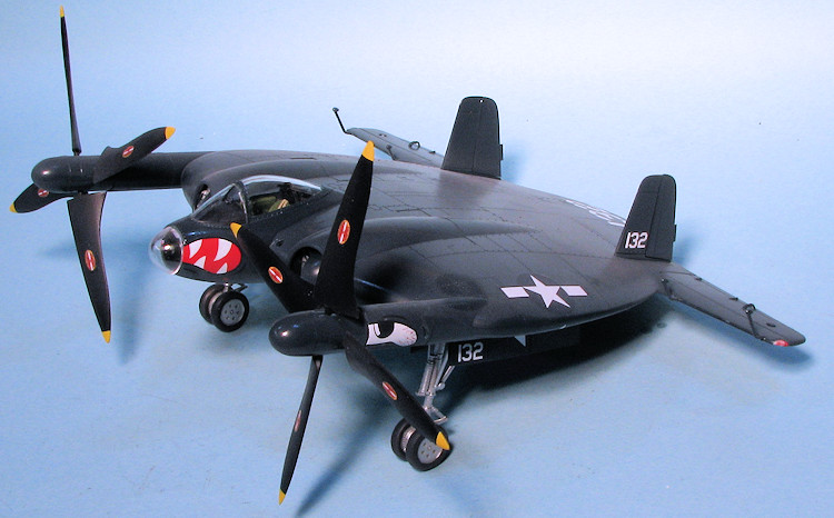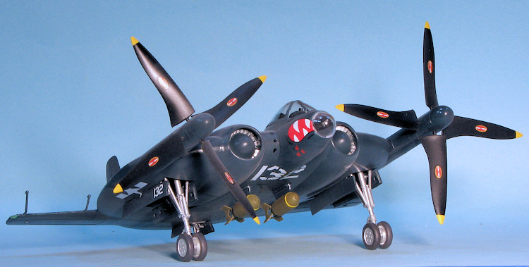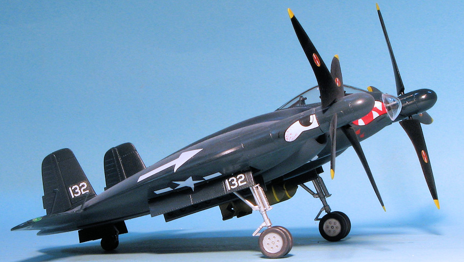 While pretty late in the game, I finally got around to the decals. To be honest, I did not what to do any of the kit markings so looked through the decal stash and came across Microscale 48-4 for the F6F. I homed in on the 'cats mouth' used by VF-27 and the arrow marking used by VF-84. Doing a bit of cutting and fiddling, I installed these along with some of the code numbers and the insignia from the kit decals to make a somewhat interesting 'WWII 1946' aircraft, despite the fact that the plane never flew. Once all the markings were on, I added the prop markings and the final bits. These were mostly clear and were the nose cap, formation lights and the landing lights on the stabs. I also glued on the bombs and the props. Note that these spin towards the middle. A bit of exhaust smoke was added and that was pretty much it.