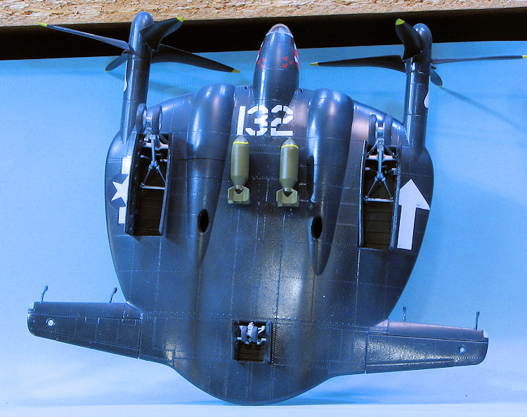 The horizontal stabilizers are in three pieces. There is a forward section that contains the formation light and mass balances. Then there is an aft section onto which one then attaches the aileron. Aileron hinges are provided. The prop hub is four pieces on either side with forward halves containing the mounts for the blades and an aft extension piece. The blades then simply slot into the forward section. These should be mounted so they turn outward. I'm not sure why they couldn't have molded the fore and aft tubes as one as the blades do not rotate, though one can position the blades any way one wants when gluing the fore and aft tubes together. This assembly then fits into appropriate areas in the fuselage. Not sure how firm the blade supports are, but I'd install the blades after attaching the mounts. On the 1/72 kit, these easily broke. The last things to attach are the unusual upper fuselage arrestor gear, which is molded in the extended position, then the canopy, which is shown only in the closed position, as well as a pair of bomb racks and bombs. The holes for these racks are pre-drilled and again, I wish Kitty Hawk would leave that option up to the builder.