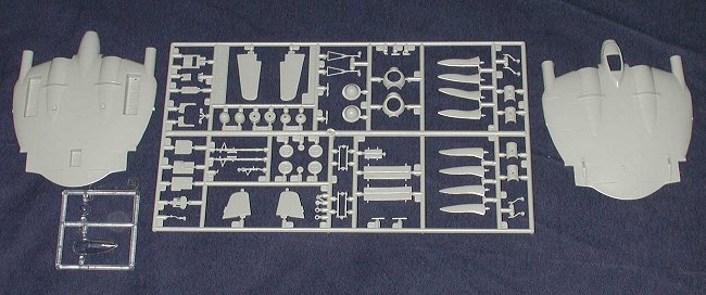The general overall detail of the kit is fairly good despite the sink marks and flash. Panel lines are engraved and well done. The kit has a full cockpit with sidewall detail. A decal is provided for the instrument panel. There is no engine detail, but you do get cooling fans and bullets. Should you desire, you can build the kit with the gear up though there is no display stand provided. Landing gear wells are complete with detail and the gear are properly detailed and petite. Prop blades are separate so you'll have to properly align them when building the kit. The two clear parts for the canopy and what I guess is the nose radar are provided. The canopy is a one-piece affair so you cannot display the canopy open unless you cut it.