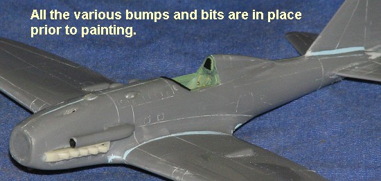 While all that filler was drying, the fin was glued in place. The fin root on the left side of the fuselage was higher and wider than the one on the right. O---K. Well, nothing that glue and filler won't fix so that was glued in place and carefully aligned with the position of the wings. Meanwhile, the prop had to be assembled. First thing was to fill the two large sink marks in the spinner. Then I started gluing on the prop blades. This kit uses an interesting method to do this. The center of the spinner back is a rather large tube. To this tube, the root of each blade is glued. This means that you really need to have the spinner there to check for proper alignment and so each blade was glued on separately and left to dry before being checked for alignment and then the next blade added. Tedious, but required. I also glued the various bits for the lower radiator bath into place. This includes both the oil and coolant radiator separated by a small bulkhead (which is too long and needs to be trimmed once in place).