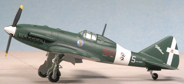Then the masking got underway. There was a need to free-cut several of the sections. I then glued on the radio mast and used a small piece of tubing for the pitot tube and glued it in place. For the rest of the paint, I again used some of my Aeromaster Acrylic paints, spraying it right from the bottle. This shade was 'Italian Green 2', a rather dark olive shade. Once it was dry, the airframe was again given a misting of Future. I then took off all the tape to check for runs, drips or errors. Not many, but a few into the white band. A bit of scraping and a bit more Future and it was time to finish up the aircraft.