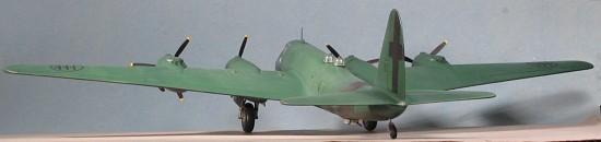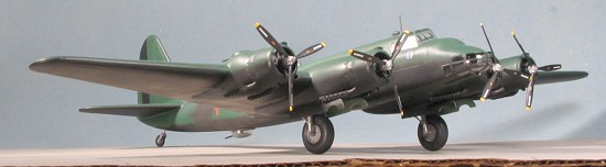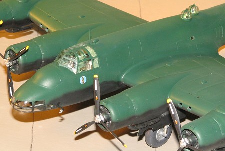 Last things to do were to glue on the props (making sure they were on the proper side as shown in the instructions), give the newly attached bits a coat of matte clear to hide the gloss glue marks, and remove the masking from the windows. A bit of medium grey pastel exhaust stain, and I was done.