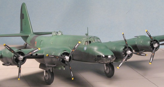 During the time this was drying, I assembled the props. This is one of those separate hub, separate blade deals. Fortunately, the blades fit into cavities in the hub so attachment isn't a major problem. That only left alignment and pitch to worry about! The props are handed with one side turning one way and the other side in the opposite direction so don't get the blades mixed up! Once assembled the props were painted black with aluminum hubs and yellow tips. I had to drill holes in the back of the hubs so that they would fit on the little stubs that protrude from the engine crankcase.