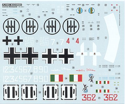 The instruction sheet is two folded sheets of paper giving 8 pages in black and white. Five pages contain the 13 construction steps, one for a history and two for markings and paint guide. Because so few Re.2005s were built, there are not many options, but the decal sheet provides three. One for 362a Squadriglia, one ANR plane and one German marked plane. All three are painted in in dark green upper with light grey lower surfaces. The 362 and German plane have a white fuselage band. The decal sheet itself is superbly printed by Cartograf and the markings are crisp and in full register. The white areas seem to be double printed so there should be no problems with bleed through. As a final note, Mr. Kit produces a full line of quality acrylic paints that are perfect for those who are into WWII Italian aircraft.