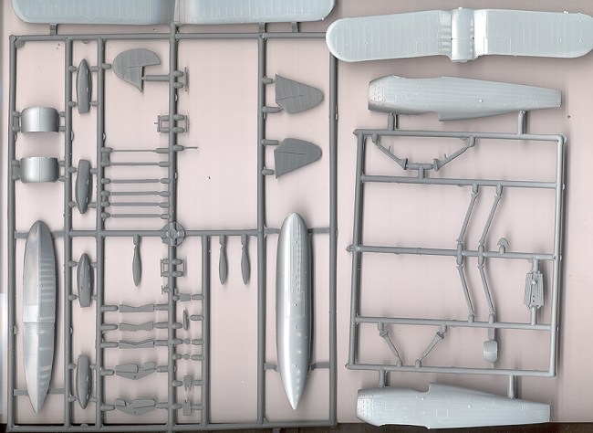 The injected part of the kit is on two sprues of medium grey plastic. The surface detailing is very good, especially the fabric portion, which does not fall to into the trap of 'hills and valleys'. There is a rather odd deformity on the right side of the upper wing that looks like air bubbles trapped between two halves as the deformity is mirrored on the underside of the wing as well. The rest of the kit is very well detailed with the usual fine engraved lines that will disappear under any major sanding. No sink areas, no ejector pin marks in places that will be seen and only a tad bit of flash. The kit supplies two vacuformed windscreens.