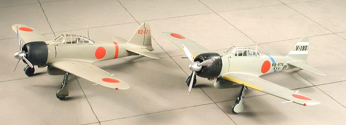 Just in case you want to see the difference between the old and new colors of early Zeros, here's a shot of this kit with a similarly painted one done several years ago. As you can see, the difference is not huge, but it is there.