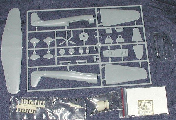 This is Valom's second kit and from the looks of it, an improvement over their first effort. The kit itself comes in a ziplock bag (a great idea, by the way), and consists of a full sprue and separate lower wing. Surface detail is excellent and there is no flash, ejector pin marks or sink areas in any places of consequence. Resin is used for the engine, spinner and cowling. The engine is a separate block and cylinders. While I'd prefer to have a more simpler construct for the engine, this one has holes in the block for the cylinders, unlike the MPM engines on the Wellington I built which just had flat mating surfaces. The etched fret contains the instrument panel, rudder pedals, seat belts, dive brake attachment points, and a myriad of small pushrods for the engine. Two nicely done and thick vac canopies are provided. I like thicker vac canopies as it makes them much easier to work with.