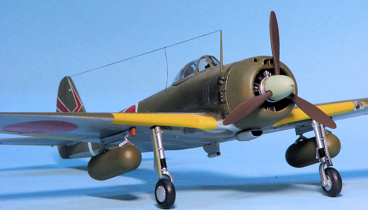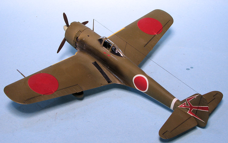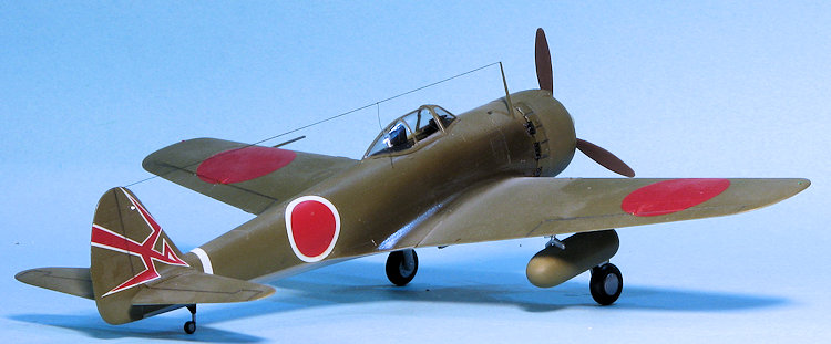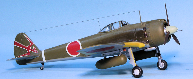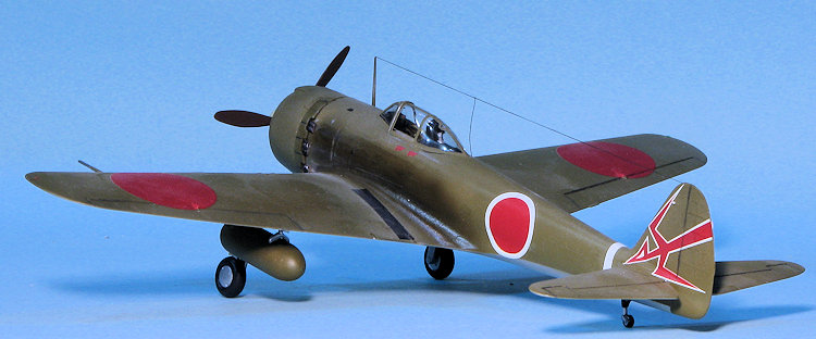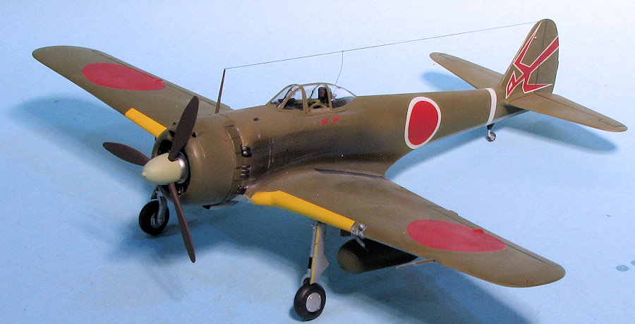 The wing required some trimming on the fuselage to get into place and even then the fit is not all that good. I ended up having to use filler on just about all the areas where the wing attaches to the fuselage. The gun sight and other external cockpit bits were glued on, then the windscreen and canopy were masked and glued on. I then masked off the lower aluminum and painted on the rest of the olive drab. This included the drop tanks, which apparently could be OD, aluminum, primer grey-green, primer brown or even a yellow. It seems the tanks were pretty much universal and could fit any IJAAF fighter.