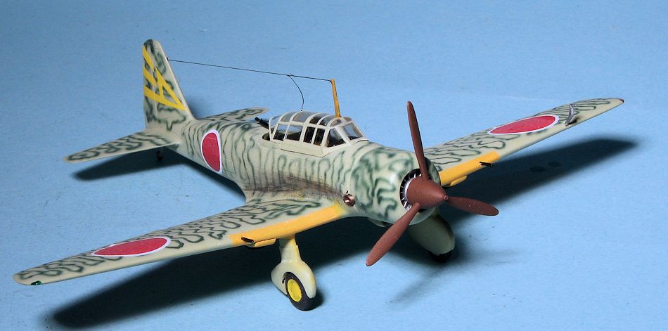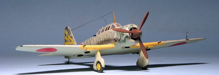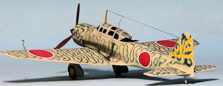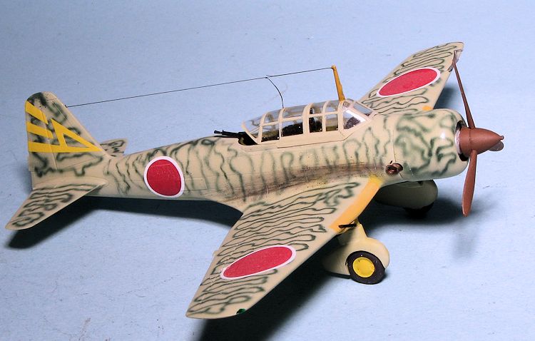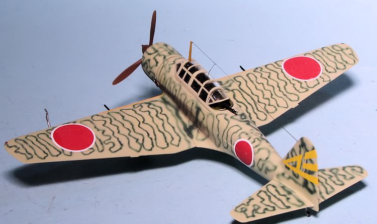 For this build, I went with one of the markings on Rising Decals 72060. All of these are late war planes so hadthe upper surfacespainted in either a solid or mottled green with yellow wing leading edge ID bands. I first painted the bands over the extant light grey and then masked this area. Then the airframe was painted with Aeromaster IJAAF green-grey acrylic. After that had dried I sprayed on the camouflage using a Nakajima Army dark green from the Colourcoats line. This was clear coated with Future.