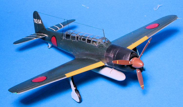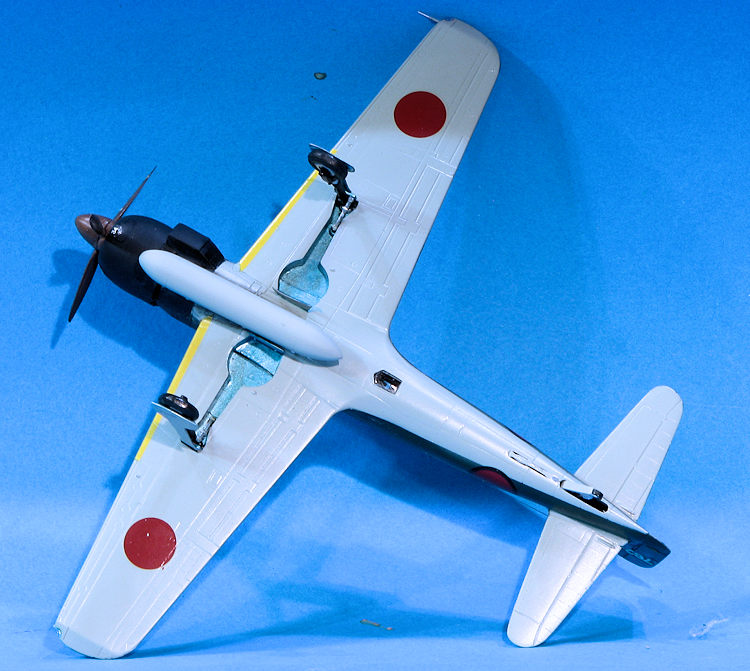 The only colors I had for this kit were Aeromaster acrylics so I first sprayed it all with Tamiya extra fine primer. This included the prop, drop tank and the gear doors. The gear legs were painted black. When dry, the prop was painted a leather brown and the cowling with Mitsubishi blue-black. Now I have a suspicion that these cowlings were really black and weathered to a blue-black, but I've been using this shade for years and have never had a knock on the door from the Farbe Polizie. When dry, it was masked off and the underside painted with Nakajima Navy grey. More masking and the Nakajima Navy Green was sprayed.