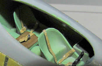 The gear well was painted aluminum and I prepainted all the other gear bits with this color. Then the instrument panel and consoles were painted black with the central seat painted a leather brown. I installed Eduard IJN belts to spruce things up a bit.