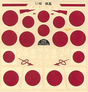 The kit decals provide four different markings options. The first is overall green with a blue underside from the 502nd Temporary Interception Corps with white 'bandages' behind the Hinomarus and a gazelle on the cowling. Next is a bare metal aircraft from the 104th Air Group in Manchuria. The third scheme is from the 58th Special Attach group in green over blue-grey. Finally, another green over blue-grey aircraft of the 2nd Squadron of the 11th Air Fleet in the Philippines in 1944 .