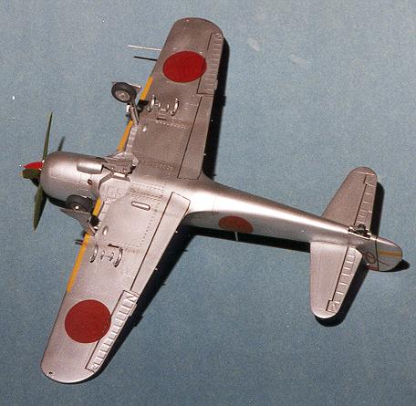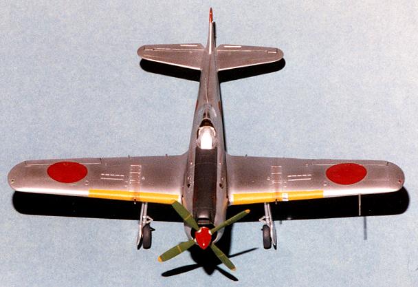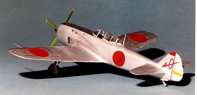 the initial coats were sprayed on. Later the airframe had the panel lines outlined in dark grey and then the silver was misted on to almost cover the panel lines. A few sections were painted in aluminum to break up the solid color. The prop hub was painted red and the prop itself a medium green that is peculiar to Ki-84s. The yellow tips were painted yellow and the stripes were Scalemaster decal stripes. The anti-glare panel was painted blue-black, the tip of the tail red, and a stripe on the rudder was painted yellow. Naturally, I am leaving out a lot of the back and forth repainting that is normal for me as I always goof a bit on paint schemes the first time around.