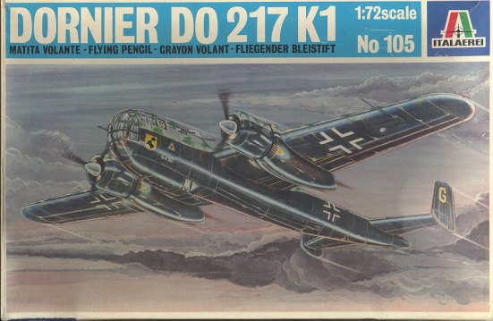 Italeri (formerly Italaerei) has a well deserved reputation for producing interesting kit in 1/72. They are currently the 'helicopter kings' but in the late 70s and early 1980s, were well known for producing a rather substantial line of desirable WWI subjects, many of which are still not bettered (or produced by anyone else). Among their list of accomplishments were a number of German bombers, including a couple of Do-217s. The E/J were done by Airfix, so Italeri chose the K version. Packaged in those miserable 'open and both end' boxes, the kit is molded in a dark grey plastic. Detailing overall is really very good, though of the raised panel line variety that was common.