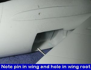 With the wings and fuselage relatively complete, it was time to mate the two. There is no positive alignment with these, just a butt join. That isn’t good enough for me so I drilled holes in the wing to accept a section of paper clip. Then I lined it up with the fuselage and, after making a mark as to where it should be, drilled a hole in the fuselage to accept the pin. I used a #64 drill bit for these holes as it is about the same diameter as your standard paper clip. The join area was coated with superglue and the wing glued on. Only a minor amount of fiddling was needed to get them aligned properly.