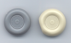 Next the resin bits were removed from their blocks. The resin tires are 'flattened' though detail-wise, don't seem to be an improvement over the plastic ones in the kit, as you can see in the image to the right. The ejection seat is an improvement over the styrene one, but my copy had a lot of flash and required quite a bit of clean-up of mold lines as well. Fortunately, Eduard's slightly greenish resin is a lot more dense than the typical tan stuff I'm used to dealing with so can take some rather rough handling without breaking.
