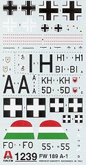 Clear parts are fairly well done with well enhanced frame lines. The also had more flash that I'd like to see and the attachment points are rather thick, making it difficult to not damage the clear bits when removing them from the sprue. The plastic itself is on the distorted side. Instructions are superb as is always the case with Italeri kits. Well drawn construction diagrams and an equally well done color and decal placement guide. All colors are referenced in generic names as well as both ModelMaster enamel and acrylic lines. Decals are well done and provide markings for four planes, all Russian Front in RLM 70/71/65 with the usual yellow fuselage bands and lower wing tips. From the Luftwaffe are aircraft from 3.(H)/Pz 12 and 11.(H)/Pz 12, differing only in codes. In a patchy white temporary camo is one from 1.(H)/31, this one without the yellow ID markings. Finally, a Hungarian 189 from 3/1 squadron, also in standard Luftwaffe camo and Russian Front ID markings.