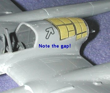 Once dry, I sanded the area smooth as I could. It needed a second application to take care of some glitches. During all this handling, the aft gun broke off its mounting. With that out of the way, I tried to glue the gun in through the closed up interior bits, but only succeeded in breaking the barrel! Muttering under my breath, I installed the instrument panel (into which I placed some Reheat instrument decals) and then glued in the control column (again) and finally the nose section. Fit is fairly good, but not really perfect. I'd had it with sanding on clear bits so left the slightly too big nose section as well aligned as I could.