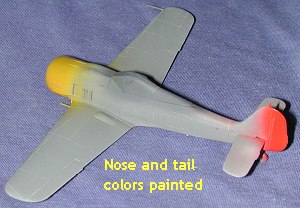 First thing I did was to spray the canopy area with RLM 66 and then the nose and rudder with white as a basis for the colors that will later be applied. I chose the version with the red rudder just to add to the color of the model. The nose was, of course, painted yellow. I used Xtracolor for the yellow and Humbrol for the red and purely because I had them already mixed up and ready to go.