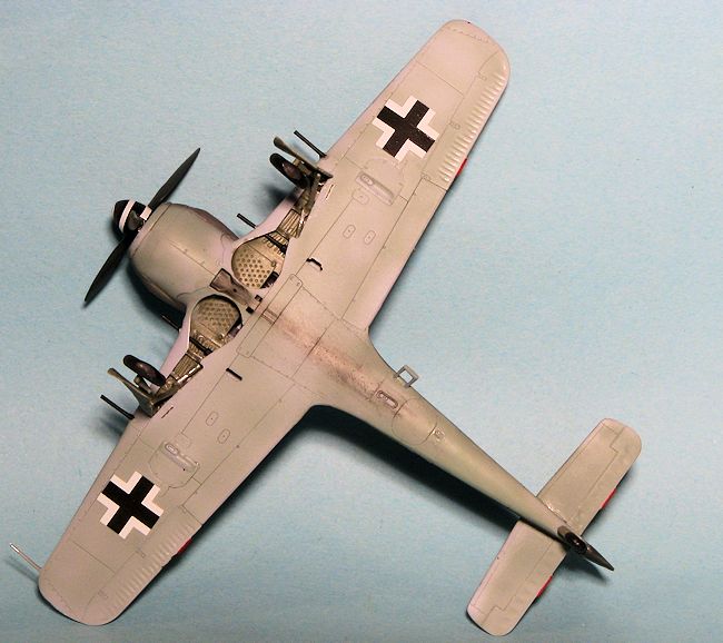 This and several other A-8 variants were on Aeromaster sheet #72-140; RammJaegers Pt. III from early 1997. Of course, this option is not a rammjaeger plane so I did not have to concern myself with making additional armor plating or sweat having to figure away to do the armored glass bits. What I did like about it is that the fuselage was not a mottled pattern, but an almost solid RLM 74/75 sprayed in varied pattern that left only a bit of RLM 76 on the fin/rudder and the fuselage side. The instructions stated that this pattern was also on the upper wings, but without a guide, I just left it as the standard pattern. I used Model Master Enamels for these colors and hand sprayed the patterns using my Iwata Revolution and very thin paint. I set the airflow at about 8-9 psi and it worked very well.
