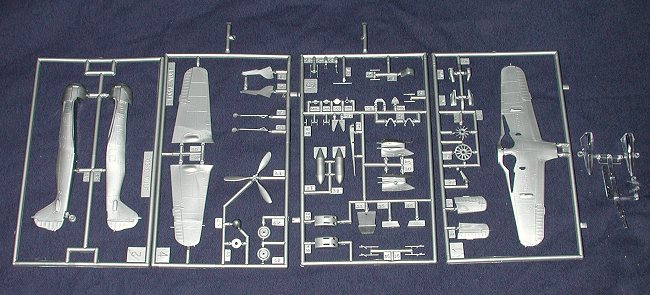 Upon opening the bag, one is confronted with a number of sprues in silver plastic. I like silver plastic much better than the blues, yellows and greens that sometimes come in Heller kits. You get two canopies, one bulged and the other normal. You also get a nice array of things for under wings such as twin 20mm cannon packs or a single 500 kg bomb for the centerline. Missing is a drop tank which would have been very nice to have. However, most of us have spares bins to find such things.