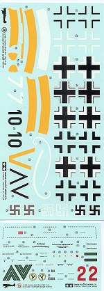 First aircraft is white 7 from 1/SG 2 in Hungary during 1944-45. It has a yellow fuselage band and 'V' under the left wing. Next is << from an unknown unit in spring 1945. It has a yellow nose band. A desert camo plane from 2./SG 4 in Italy is probably in RLM 78/79/80 with the upper half of the fuselage band over-painted. Finally, a I./SG 2 aircraft, again from Hungary in 1945, has a winter camo scheme and a red forward cowling. Most have the 'blown' canopy, though the Italian front aircraft is an earlier one with the 'straight' version. The 'blown' canopy was added to production planes starting in January 1945. Decals are a bit thick though they should work well with some care.