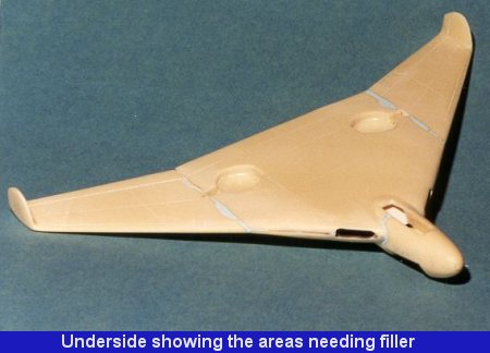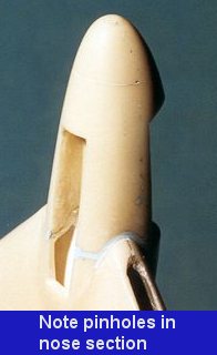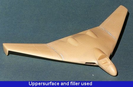 Next step was the joining of the fuselage top and bottom. Just before this, two very large fishing weights were glued in the fuselage to prevent tail sitting. This was a rather painless exercise and fit of the upper and lower halves is quite good. Some gaps in the leading and trailing edge were filled with superglue or putty and then sanded smooth. Unlike many early resin kits that had a score of air bubble just below the outer surface, this kit is relatively free of them, however my vigorous sanding caused a number of them to appear on the upper surface of the wings. Using a very thin filler like Mr Surfacer, I was able to fill in the holes. Once the fuselage center section is finished, the outer wings are joined. Either due to a construction glitch on my part or differences in manufacture, one of the wings didn't have the same chord as the fuselage it was designed to butt up against. Not a real problem, but it did require some filler to smooth things out. There is sufficient area on the wing/fuselage join that no additional reinforcement was needed. It is imperative that you sand the wing join area to the correct angle. Lots of dry fitting is the answer to this possible dilemma. Somehow, things went right for me and both wings are at the same dihedral!
