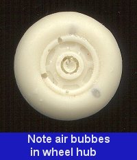While this was drying, the landing gear components were removed from the resin wafer and cleaned up. The wheels were also cleaned up and it was here that the worst of the air bubbles presented themselves. Unfortunately they were on the rims of the main wheels and impossible to repair (sigh). The hubs were drilled out to accept the resin gear and the gear attachment points in the fuselage were also drilled out. Next the landing gear struts were painted aluminum and when dry superglued into place. For the first time, the aircraft was standing (a bit shakily) on its own landing struts. The rear struts have smaller retraction struts to help stabilize it. The front wasn't provided with one, but one was found in the spares box and added. The wheels will be installed along with the doors later, after painting.