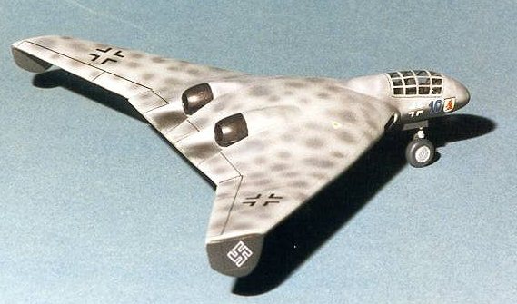 In 1944, three design studies were performed by Focke-Wulf in response to a specification that called for a medium jet bomber able to carry a 1,000 kg load, 1,000 km at a speed of 1,000kph. Hence the 3x1000 designation. Focke-Wulf entered three designs; a Projekt A, B, and C. The most interesting of them was Projekt B, the subject of this kit. Unlike the more conventional Projekts A and B, this aircraft was more of a flying wing with the HeS 011 turbojets buried in the wing. The wing was swept 25 degrees and had downturned rudders on the tips of the wings.