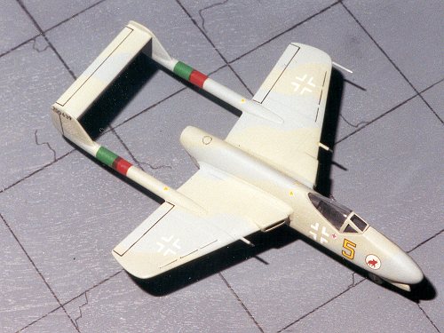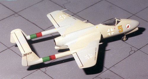 It's design speed, armament and other features were extremely close to that of the Vampire and it would have been interesting to see the two in combat. The 226 was to be powered by an HeS 011 turbojet and armed with two MK 108 30mm cannon in the wings and two MG151 20mm guns in the nose. The TL version which is represented by this kit, also had a liquid fuel rocket engine mounted under the turbojet This extra boost would allow it to go from the ground to 24,000 feet in about 70 seconds under the power of both motors. Projected max altitude was 46,000 feet (14,000 meters) and 516 mph (830kph), a bit slower than the turbojet only version. Imagine the problems of telling friend from foe were the types to come into contact with each other. Undoubtedly one or the other would have been marked with large color bands as was done when the P-47 came into service to prevent confusion with the similarly shaped FW-190A.