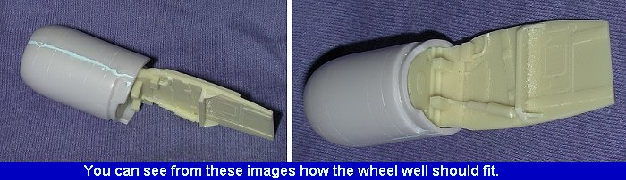 Need to drill out the wheels as well to accept the axle stubs as there is no pre-drilled hole. Before installing the wheels, there is a retraction mechanism to install. This is made up of two small resin parts which are to be butt joined to two 'A frame' mounts. This whole assembly then attaches to the gear on one end and the wheel well on the other. Again, there are several resin to styrene joins that have to be made. Not the best way to do this, in my opinion. It would have been much better off to have the parts either entirely in resin, or entirely in styrene. Preferably in styrene to make for a stronger join.