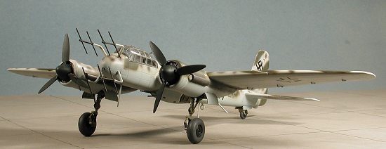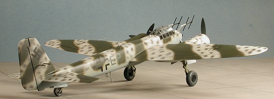 With the canopy in place, I installed the props and put in a short section to represent the retractable antenna just aft of the canopy. No long wire is needed for this aircraft. Out came the pastels for the engine soot. It was then I noticed that there was no wing pitot tube on the plane. I couldn't find anything left on the sprues to put in the hole, so I made one and installed it. We won't even talk about the missing landing light. A bit of final touch up painting, a spray of matte clear and the masking was taken off the canopy. Finally, the clear ADF antenna was snapped into the housing in the upper fuselage. After all of that, I had a decent representation of a Ju-88G.