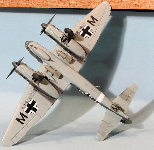 But this was not all as I had to install the guns. After laboriously removing the canopy masking, I installed the clear rear canopy gun mounts. These needed to be hand painted and so it was done. For the rear gondola guns, I had no choice but to cut most of the twin guns away and then just glue it in place. The main canopy guns were all attached using clear gloss paint as was the radio mast. This was then glued back onto the airframe. I removed the rest of the masking and using Tamiya Weathering Kit, applied large soot areas under the wings behind the engine. I applied a bit lighter amounts on the tailplanes. Then the bombs were glued on. I only attached two on the inner pylons as a full bomb load was infrequently carried as it limited range. The last step was to add a radio wire using EZ-Line.