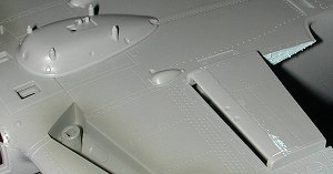 There are also little forward hinged areas on the front of the radiator inlets. These can be cemented in the lowered position if one wants, but rarely are they seen like this unless the engine is running. It is unfortunate that they don't fit as well as most of us would like in the 'up' position. Finally, I glued one of the elevators onto the lower section and left the top of the tailplane off so you could see how they are attached.
