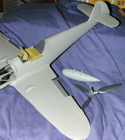 As much as I wanted to spend quality time working on the model today, too many other things came up to occupy my time, including having to get Friday's kit finished! However, not all was lost. I did manage to sand off the third coat of filler on the lower wing/fuselage join. Then I sprayed the windscreen and the back section RLM 66 and finished the touch-up spraying of this color on the other canopy bits. I also did some RLM 76 painting on the underside of the tailplanes and a few other areas to check for gaps.