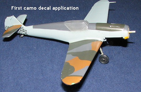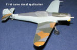 The Champ worked fairly well on some of the more difficult decals, but the end result was still a lot of wrinkles around the areas that had to conform to compound curves (like wing roots and tips). I found that I had to cut the fuselage band in half to get it to properly conform. I suggest painting this to be sure it matches the wing tips and lower cowling color. In several portions along the fuselage, you have to put down the mottle, place a marking decal down to fit into the 'cut out' sections, and then place another mottle decal down to fill in the holes. Rather fussy and one that works OK, but not great. I then added the usual markings over the top of the camo ones.
