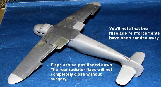 Then it was time for the things on the rear of the wings. The radiator cooling flaps cannot be assembled in any other way than 'almost' closed. They won't fit closed tight and if you decide to cut them off and display them any other way, there won't be anything in there to see. Again, the radiator blanks are just that and have no detail. Fit of these is fairly good so no real worries there. The flaps are not intended to be dropped, but then it isn't that difficult to cement them in a lowered position and that is what I did to mine. I also took this opportunity to glue on the supercharger intake. One half of mine had a lot of flash and the other half was slightly short shot so I just sanded the opening down once it was glued. Like lots of kits, it does not have the flange that runs the length of the outer portion.