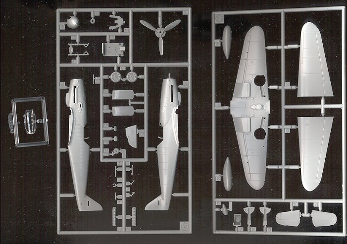 What is in the box other than a great decal sheet and instructions are two sprues of light grey plastic and one canopy (single piece and non-opening). The molding is what one expects from today's (well actually 1996), modeling art. Fine engraved panel lines, a full interior, and complete wheel wells. In addition, you get a separate rudder. Actually, I would have preferred this to be part of the fuselage halves as it isn't a complete rudder, leaving the balance area on the fin itself. Another anomaly and one that is rather difficult to understand, is that the supercharger intake is a solid piece and not hollow. Sure, it isn't a big deal for most of us to drill that out, but it shouldn't be required. Another oddity is that the chin bulges (to clear some oil cooler lines) are separate items. Molding these in with the fuselage would have looked so much nicer. One can only suppose that this was done so that another version could be kitted from this mold, but as of yet, none has been done. Finally, the armor plate is molded as part of the fuselage, wherein it was really a separate bit that attached to the canopy.
