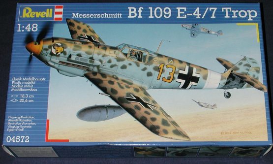 Instructions are the usual newsprint versions typical of RoG. They provide color information using what appears to be Humbrol paint numbers. 'RIM' numbers (I think they mean RLM) are provided on the decal and overall camo page. Markings (without swastikas) are provided for three aircraft. One is the box art E-7/tropaircraft from 3./JG 27 as allegedly flown by Hans-Joachim Marseille in early 1941. It is sand with dark splotches over RLM 65. Since the underside is RLM 65, the sand is probably one of the various Italian colors. The green splotches are stated as RLM 71, but again, I think it most probable to be an Italian color. A true factory painted desert scheme would have had an RLM 78 underside.